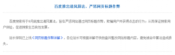 7月份,百度推出飓风算法,严厉打击恶劣采集。9月14日又推出了百度清风算法,清风算法主要是针对打击不规范标题的网站。深圳网站建设公司佰达科技要提醒各位站长了,标题不规范包括哪些内容?