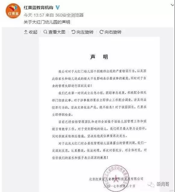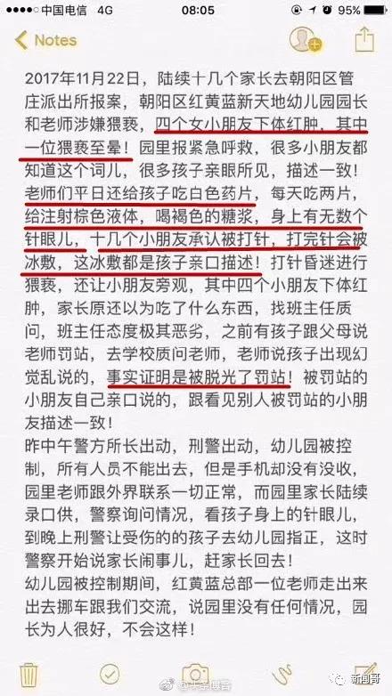 虽然还在调查中,报道一出,看的真是起了一身的鸡皮,再次刷新了所有人的三观,谁能告诉我,这社会是怎么了?家长都希望给孩子一个最佳的成长环境,却不想亲手把孩子送给了狼外婆。孩子是国家的未来,更是每个家庭的希望。感觉现在家长不是送孩子去幼儿园,而是送孩子去集中营,每天提心吊胆,怕孩子被虐待。这并非红黄蓝旗下幼儿园第一次被曝光虐童,2015年12月吉林四平市铁西区红黄蓝幼儿园教师用针将多名儿童身体扎伤,工具包括钢钉、螺丝钉、铁针等,被告人被判刑两年6个月至两年10个月。今年4月,吉林四平市铁西区红黄蓝幼儿园教师摔孩子或者用脚踹孩子,遗憾的是这次的结果仅仅是涉事院长已经被停职检查。