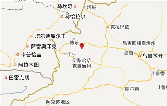 本次地震周边5公里内无村庄分布,20公里内无乡镇分布。震中距精河县37公里、距尼勒克县61公里、距博乐市93公里、距新源县98公里、距巩留县102公里,距双河市77公里,距乌鲁木齐市383公里。
