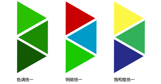 了解网站色彩的表现,以及安全色.以及色彩的联想作用和心理效果。并对将要制作的网站进行配色分析。主要有以下几种色彩搭配原则:色调统一,明暗统一,饱和度统一、如下图: